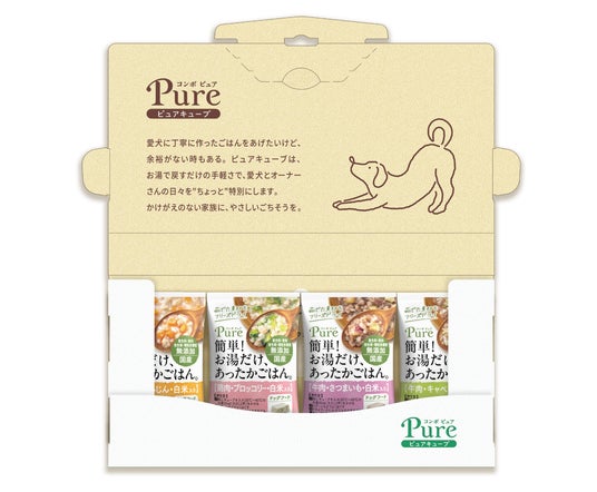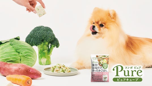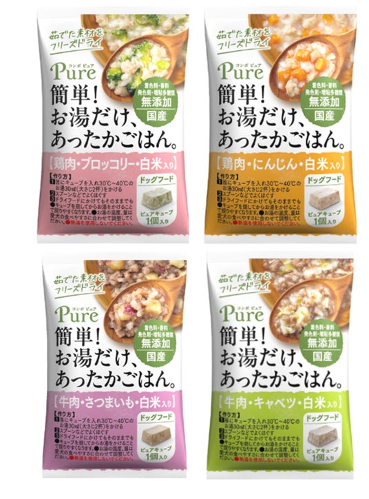 2025年5月1日、公式オンラインショップ限定販売の新商品「ピュアキューブ」を発売。愛犬にあたたかい手作りごはんを作ってあげたいけど、時間のゆとりがない...そんなわんちゃんオーナーさんのために生まれた、素材を“洗う・切る・ゆでる”手間なく、お湯を注いでたったの15秒で手作り風ごはんが作れるフリーズドライタイプのウェットフードです。野菜のスペシャリストが厳選した野菜を使用し、栄養や旨みをぎゅっと閉じ込めてフリーズドライにすることで豊かな香りや味を感じられる商品となっております。