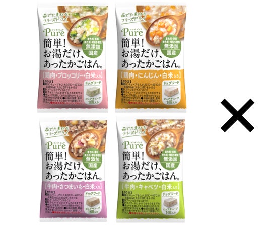日本で初めて国産のドッグフードの販売を開始した日本ペットフード株式会社から、公式オンラインショップ限定販売の新商品「ピュアキューブ」が5月1日より発売!愛犬にあたたかい手作りごはんを作ってあげたいけど、時間のゆとりがない…そんなわんちゃんオーナーさんのために生まれた、素材を“洗う・切る・ゆでる”手間なく、お湯を注いでたったの15秒で手作り風ごはんが作れるフリーズドライタイプのウェットフードです。野菜のスペシャリストである農家さんが厳選した野菜を使用し、栄養や旨みをぎゅっと閉じ込めてフリーズドライにすることで豊かな香りや味を感じられる商品となっております。