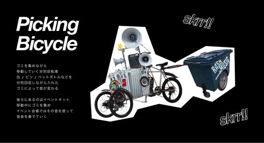 また、ゴミを収集する「Picking Bicycle」は会場内にて、ゴミを回収し、音の素材を集めるモバイル型回収ユニットとして登場。その音源を活用して“トラッシュミュージック”が奏でられるだけでなく、アーカイブ化も予定しています。