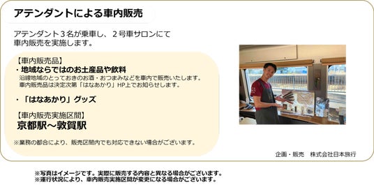 また車内にアテンダントが3名乗車し、沿線ならではのお土産品や飲料、「はなあかり」グッズを販売します。