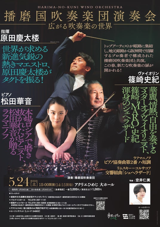 華麗・情熱・自由を奏でるマスター・オブ・ヴァイオリニスト、篠崎“MARO”史紀、本場ロシアで磨き抜かれたピアニスト・松田華音、世界が求める新進気鋭の熱きマエストロ・原田慶太楼らトップアーティストが姫路に集結し、地元姫路から阪神間で活躍するプロ奏者で構成された播磨国吹奏楽団と共演。
