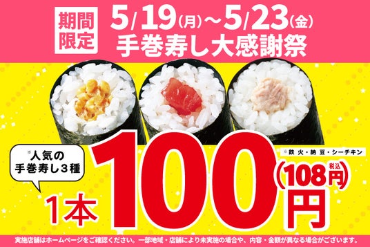 期間限定!お買い得!5月19日(月)~「手巻寿し大感謝祭」開催!手巻寿し人気の3種類を【特別価格】100円!(税込108円)で販売します!
