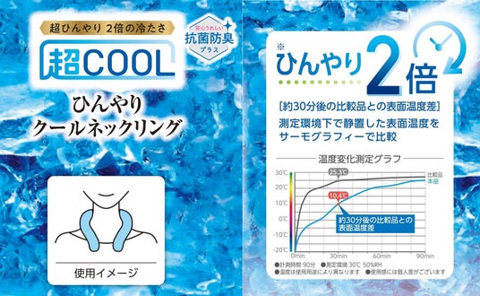 「超COOL」シリーズは、“ひんやり”にとにかくこだわった、暑い季節を超COOLに過ごせる商品です。新登場の「超COOL ひんやりクールネックリング」は、当社で販売実績のある比較品と比べて、体感でひんやり感が2倍(※1)あり、冷たさが長持ちする為、これからの暑い季節にぴったりのアイテムです。特殊なジェルを配合しており、固まっていなくても冷たさをしっかり感じられ、身体にしっかりフィットします。
