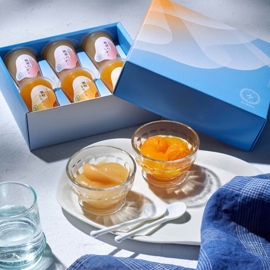 世界自然遺産・白神山地の天然水を使用したみずみずしく涼やかな2種類のジュレ。山形県産・手むき白桃のジュレと和歌山県産の温州みかんのジュレを詰め合わせました。果実のおいしさをとじ込めた爽やかな涼味を、大切な方への夏の贈りものに。