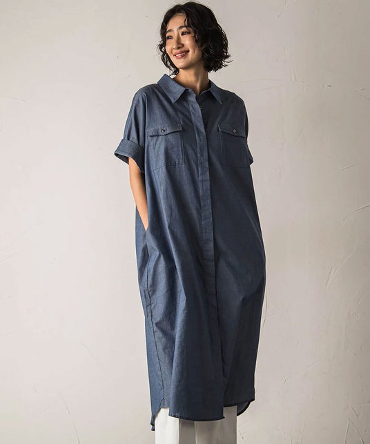 ラフな大人カジュアルスタイル。夏らしい薄手ダンガリー素材のシャツワンピース。軽やかな着心地で、これからのシーズンに