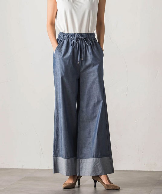 ゆったりとしたボリューム感のあるワイドシルエット。夏らしい薄手ダンガリー素材のワイドパンツ。