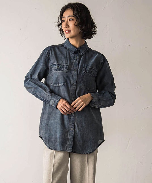 夏らしい薄手ダンガリー素材。シアー感が夏らしく清涼感のある薄手デニム素材のシャツ。カジュアル感のあるワークポケットデザインでラフなオトナカジュアルスタイルが完成