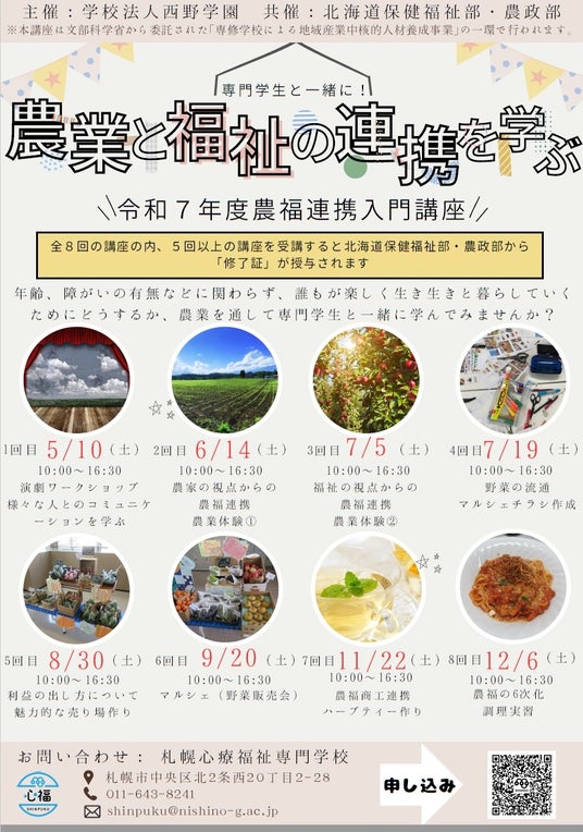 今年度、農福連携の認知度向上と理解促進のため、学校法人西野学園札幌心療福祉専門学校との協働により、広く一般の方々を対象とした全8回で構成する「令和7年度 農福連携入門講座」を開催します。