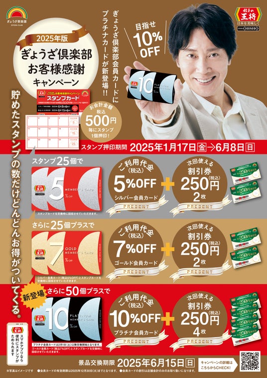 「餃子の王将」を運営する株式会社王将フードサービス(京都市山科区/代表取締役社長 渡邊 直人)は、2025年1月17日(金)より「2025年版ぎょうざ倶楽部 お客様感謝キャンペーン」を開催しています。スタンプを集めると各種割引券やお会計が毎回最大10%割引になる「ぎょうざ倶楽部会員カード」と交換できます。この度、5月16日(金)から5月31日(土)の期間限定で、「2025年版 ぎょうざ倶楽部 お客様感謝キャンペーン」のスタンプを、通常時の2倍押印する「スタンプ2倍押し!!」を実施いたします。