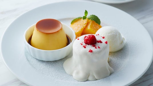 カスタードクリーム、マンゴー、ラズベリーシロップで仕立てたメルティーショートケーキとヨーグルト風味のアイス、マンゴーとオレンジコンポート、カスタードプリン(ミニ)のワンプレートです。