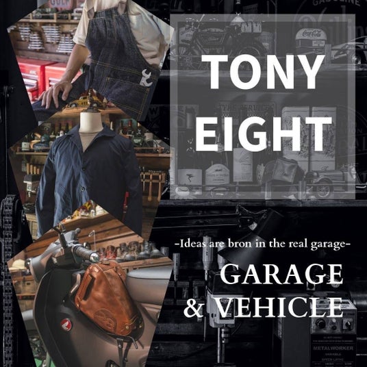 【TONY EIGHT】「乗り物」と「ガレージ」をコンセプトにこだわりの素材で 唯一無二のデザインを追求するブランド。"こだわり"を追い求め"妥協"を否定できる者たちで"モノづくり"をしよう。集まった洒落者(TONY)たちが8つ(EIGHT)のテーマで。