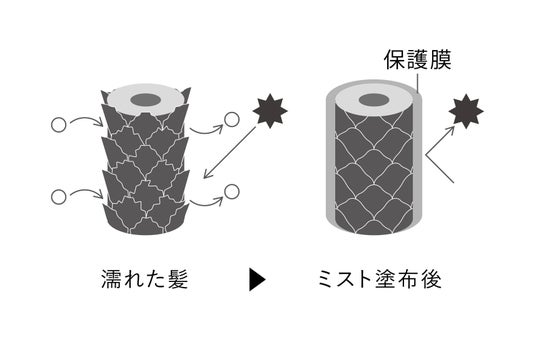 ダメージを受けた髪は、表面の膜が剥がれ髪同士がくっつきやすくなっています。パワーミストの細かいミストが擬似的に「保護膜」を作ることで髪と髪との接着が軽減され、ベタつかず早く乾きます。ドライヤー時間を短縮されることで熱ダメージも軽減することができます。