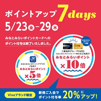 期間中、三菱地所グループカード(みなとみらいポイントカード一体型)お持ちの方は、みなとみらいポイントが10倍、みなとみらいポイントアプリは5倍になる、お得なキャンペーンを実施いたします。さらに、期間中はみなとみらいポイントアプリ会員様期間限定のショップ特典も実施予定です。【開催期間】 2025年5月23日(金)~5月29日(木)