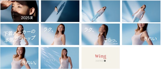 新ビジュアルでは、ラクな着ごこちでありながら美しいバストシルエットにととのえる、下着メーカーが本気でつくったブラトップ[シンクロブラトップ]や、フロント下部の「体温で変形する樹脂シート」がバストの位置に合わせて伸縮して、ここちよくフィットしてわたしに合わせてくれる(※)[マッチミーブラ]をはじめとした「ウイング」アイテムをSHIHOさんがしなやかに着こなします。また6月5日(木)からはTVCMも放映予定です。