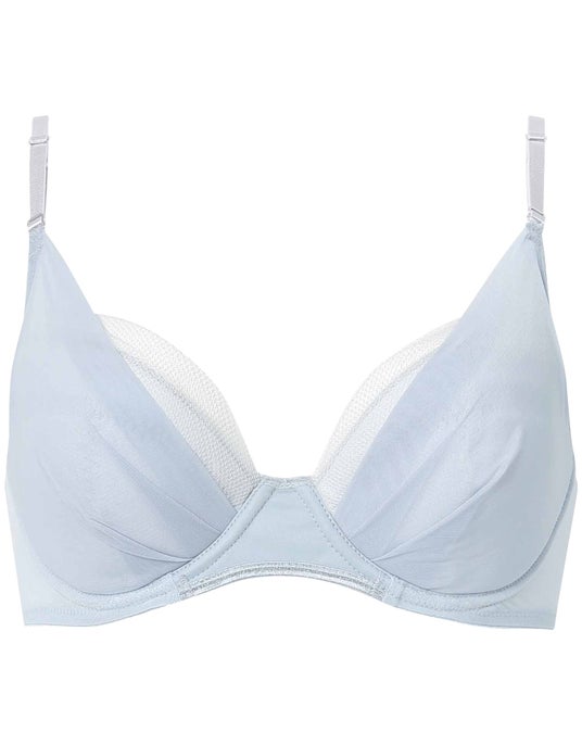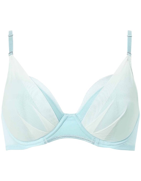 バック部分は、アンダーゴムのないフリーカッティング仕様で背中の段差を軽減。身生地部には吸汗速乾素材を採用し、カップ部分をのぞく裏打ちにはメッシュ素材のパワーネットを使用しているのでムレにくく、快適な着ごこちに。