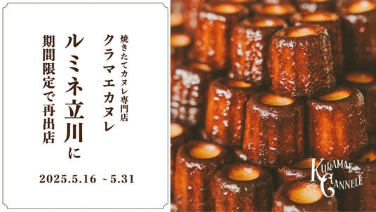 東京・蔵前にあるSNSで話題の焼き立てカヌレ専門店「KURAMAE CANNELE(クラマエカヌレ)」(運営:CLASSIC INC.、代表取締役 : 萱場俊克、本社 : 東京都渋谷区)は、2025年5月16日(金)~5月31日(土)にルミネ立川にて催事を実施いたします。蔵前の工房で焼き上げた「クラマエ・カヌレ」をその日のうちにお届けし、販売いたします。1日で3,000個販売したこともある人気商品「クラマエ・カヌレ」をぜひこの機会にお楽しみください。