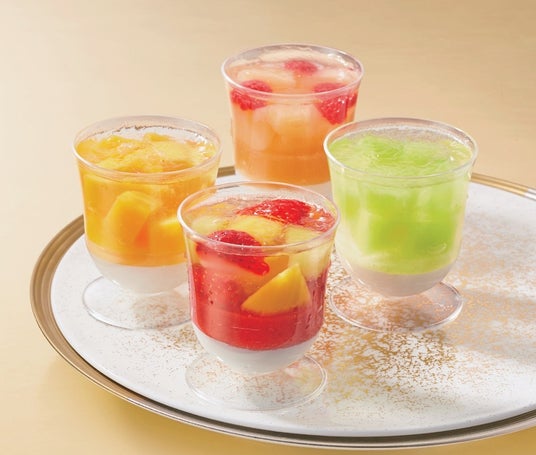 フルーツの老舗が目利きした、ご当地の特産果実を使った爽やかなスイーツ。宮崎の代表的なフルーツであるマンゴーや、静岡県産マスクメロン、岡山が誇る桃など、日本各地のご当地自慢の果実を、フルーツ専門店<京橋千疋屋>が選び抜きました。ヨーグルトムースの上に人気のフルーツをゼリーとともに閉じ込めた、みずみずしいデザートです。