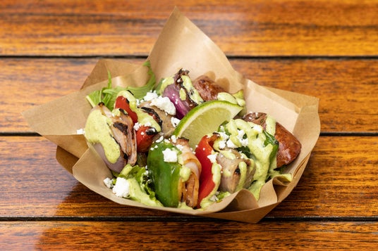 ジューシーなソーセージを色とりどりの野菜と共に串焼きに。フェタチーズの塩気とライムの爽やかさが絶妙で、コリアンダーアイオリが全体をまとめます。