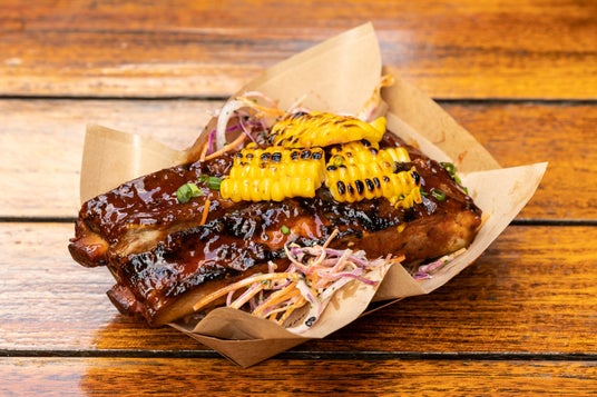 スペアリブ、コーン、BBQソース、赤キャベツ、ニンジン、パインドレッシング