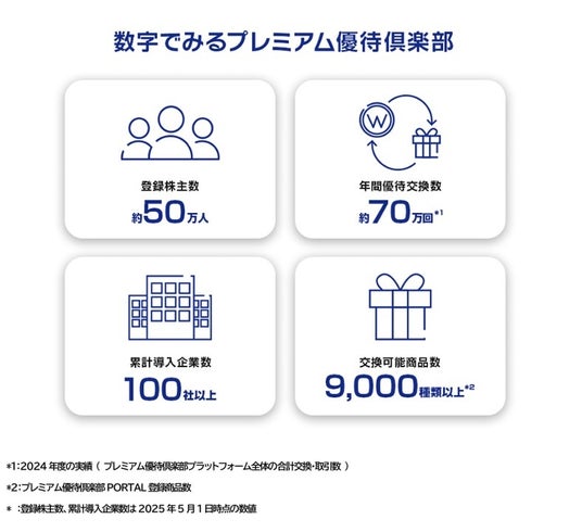 「プレミアム優待倶楽部」は、上場企業の株主の方を対象に、導入企業が発行する株優待ポイントを使って、お好きな商品を自由に選べる国内最大級の株主管理・株主優待デジタル化サービスです。