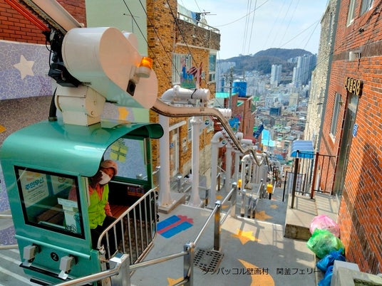らくらくモノレールで坂を上がっていくアートなスポットができました。モノレールをバックに釜山の街を写すフォトスポットをお楽しみください!(モノレールは基本的には住民優先!)