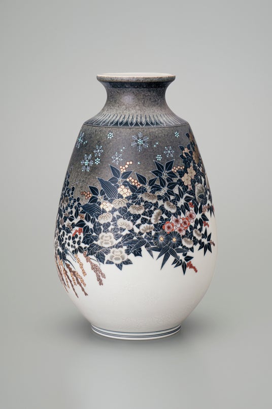 十四代今泉今右衛門先生は「色鍋島」の技法「墨はじき」をさらに発展させ、白の微妙な世界を表現した「雪花墨はじき」や白金色を輝かせる上絵「プラチナ彩」を生み出し、平成26年に陶芸部門において史上最年少で国の重要無形文化財保持者(人間国宝)に認定されました。本展は、その認定から初の秋田での個展となり、秋田開催を記念した特別な意匠作品「色絵雪花薄墨墨はじき秋田模様花瓶」をはじめ、数々の作品を一堂に集めます。