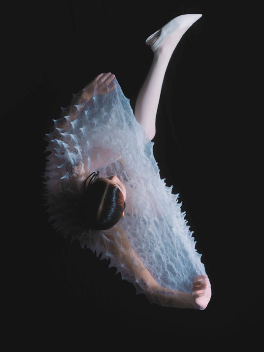 一見して非現実的にも思える立体的なマテリアルから生まれる衣服が、二次元のアートビジュアルから飛び出し、リアルクローズとしての提案へと昇華しています。
