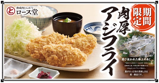 株式会社物語コーポレーション(本社:愛知県豊橋市/代表取締役社長:加藤 央之)が展開する、とんかつの専門店『熟成肉とんかつ ロース堂 豊橋曙本店』は、2025年5月15日(木)より、期間限定で九州長崎県産の“旬(とき)あじ”を使用した「肉厚アジフライ定食」など、定食3種類と単品を販売いたします。また、定食はごはん・キャベツがお替わり無料のほか、各種テイクアウト弁当もご用意しています。