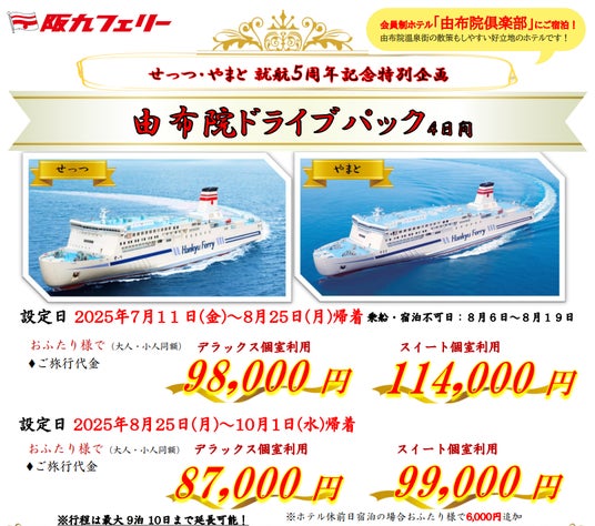 【関西発】せっつ・やまと就航5周年記念特別企画!夏休みの旅行に♪会員制ホテルに泊まる「由布院ドライブパック」販売開始!