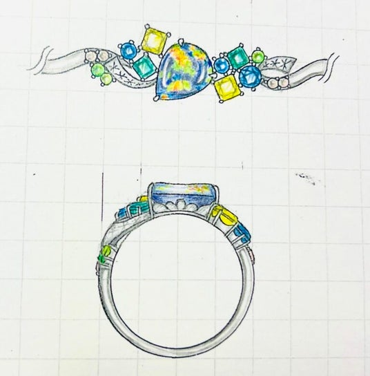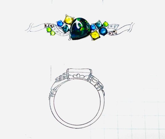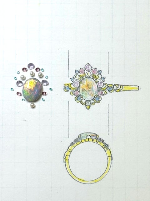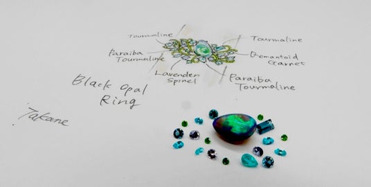 デザイン画の上にルースをセット。メインのブラックオパールに合ったサイドストーンも一緒にご提案。