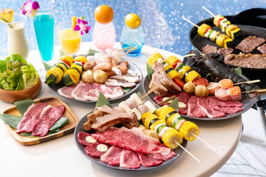 屋外の緑鮮やかな木立に囲まれたリゾート感あふれるプールサイド・レストランで、手ぶらで気軽にバーベキューをお楽しみいただけます。ランチセットは、ハーブバターで味わう国産牛や低温調理した鶏もも肉、やわらかい豚ロース、カラフルな野菜串に加え、ポテトサラダやお好みで辛さを追加できるビビンバから、デザートまでを存分に楽しめます。ディナーセットは、厳選したお肉をシェフオリジナルのサムジャンでサムギョプサル風に味わえるセットや、こだわりの国産牛を盛り合わせたセット、活オマール海老や大粒帆立貝などのシーフードと厳選したお肉を堪能いただくセットの3種類をご用意しております。また、2種類のキッズメニューは、ご年齢やお好みに合わせてお選びいただけるので、お子様連れでも安心してお食事をお楽しみいただけます。