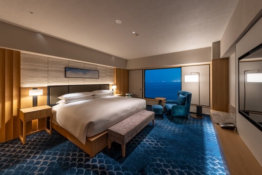 東京湾の雄大な大海原を見渡せる広々としたリビングとベッドルームは、和のエッセンスを取り入れたシンプルモダンな空間。オーシャンビューの部屋から見える海と空からインスピレーション受け、「自然のゆらぎ」をテーマにした客室です。ベッドルーム、リビングルームをセパレートしたプライベート感がある空間は、ウッドや石を用いたナチュラルで落ち着いた雰囲気です。また、パウダールームやバスルームもナチュラルなタイル、石、ウッドを用いて落ち着ける空間に仕上げています。さらにベッドルームには、リラックスチェアと、極厚マットレスを採用したキングサイズベッドを配置。ダブル洗面化粧台、独立したバスタブとレインシャワーを備えた広々としたバスルームで寛ぎのひとときをお過ごしください。