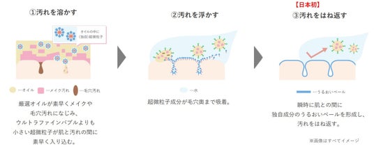 肉眼では見えない毛穴奥の汚れまで落としきること。これが毛穴汚れ悩みを解決する鍵だと確信し、日本初の超微粒子技術を採用しました。超微粒子成分が毛穴奥まで吸着し、独自成分のうるおいベールにより汚れをはね返すことで、メイクや毛穴奥の汚れまで落とします。