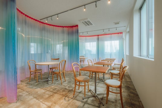 秋田県男鹿市は風も強く冬の気候は厳しいため、窓の前に空気層としてのバッファーゾンを用意することにしました。それは海の泡のように館内にもたくさん派生し、曲線を描いてフワフワと空間の中に現れ、柔らかい場を演出します。素材も不透明だったり半透明のものだったり、布だったりとすることで、さらに多様な空間を生んでいます。滞在する旅行者がここで心身ともに癒されてほしいと思いました。