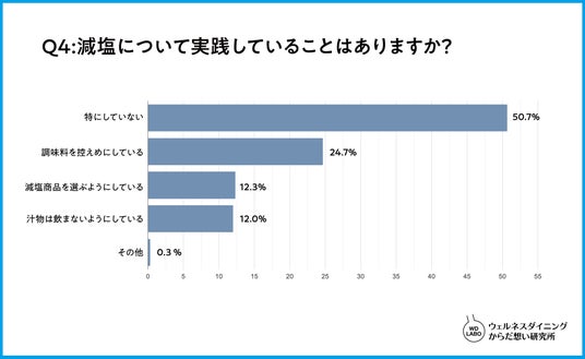 全体の50.7%が「減塩は特にしていない」と回答しており、健康維持における減塩の重要性が、まだ十分に認識されているとは言えない。