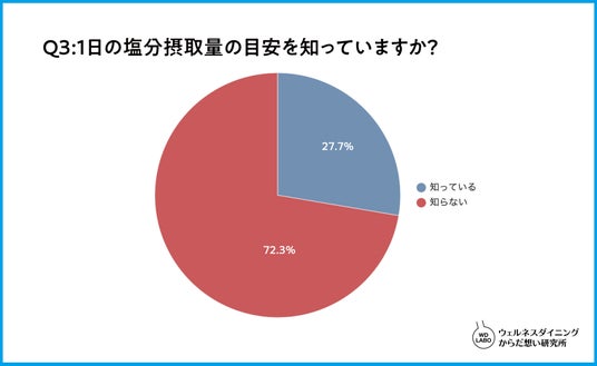 推奨されている塩分摂取量の目安を72.3%が「知らない」と回答しており、1日にどの程度、塩分量を抑えるべきか認知されていない。