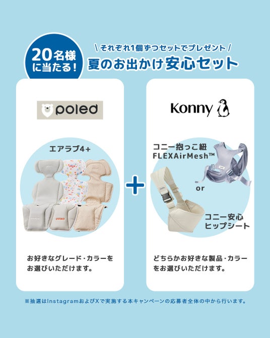 本キャンペーンではPoledの赤ちゃん用クールシート「エアラブ4プラス」と、Konnyの抱っこ紐「コニー安心ヒップシート」または「コニー抱っこ紐 FLEX AirMesh(TM)」をセットにした『夏のお出かけ安心セット』を、InstagramおよびX(旧Twitter)にて合計20名様にプレゼントいたします。
