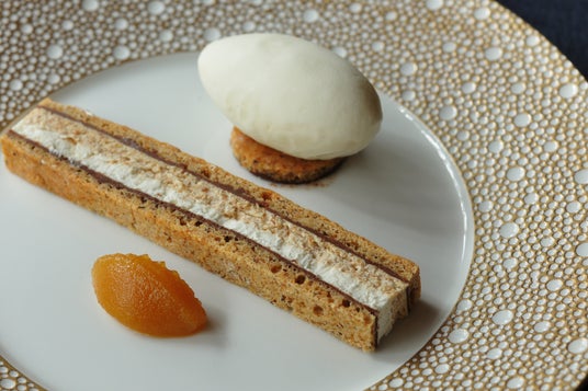 フランス発祥のクラシカルなデザートであるマルジョレーヌケーキを、沖縄で親しまれているジーマミ(落花生)でアレンジをしました。きめ細かく泡立てたクリームに、ジーマミのアイスクリーム、パイナップルのコンフィチュールを合わせています。ジーマミの優しい甘さとパイナップルの程よい酸味が特徴のデザートです。