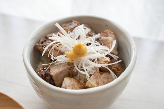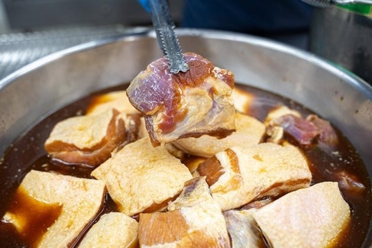 脂身と赤身のバランスが絶妙な豚バラ肉を秘伝のタレに一晩漬け込み、柔らかさと深みのある味わいに。