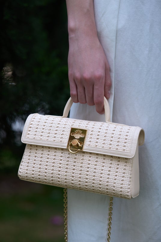 外側は、高級イタリア製スムーズ牛革トリムとリネンコットン混紡で、精巧な編み込みパターンをデザイン。牛革のマットな質感としっかりした手触りが高級感を際立たせ、パターンの合間から除くリネンが立体感と軽やかさを演出。リネンの白さで抜け感のある涼やかさも醸し出します。