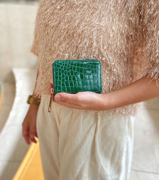 表面はクロコの美しさを生かしたシンプルなデザイン。内装はじゃばら仕様のカード入れ&小銭が取りやすいコインケース