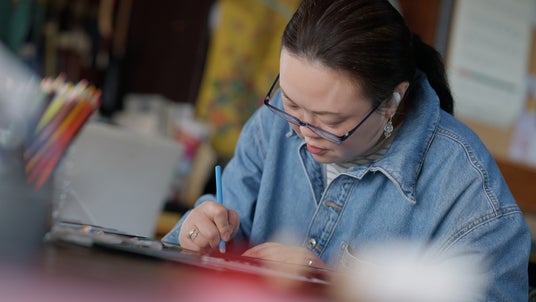 幼少期からものづくりが好きで、絵を描いたり、人形の服の制作をしていた。9歳の時、家族と共にユーラシア大陸を列車で横断した経験は、彼女の創作活動に大きな影響を与えた。2015年頃、臨床美術の教材で紙やすりに色鉛筆で描く技法と出会い、そのざらついた描き心地と独特の質感に魅了される。以降、自身の表現のひとつとして取り入れ、音楽のリズムや感情の高まりに導かれながら、鮮やかで直感的な色彩を生み出すようになった。本作「つながる風景」は、6cm×18cmの紙やすりに描かれた作品を10枚並べたもので、それぞれには友人のイメージや音楽から受けた影響が込められている。