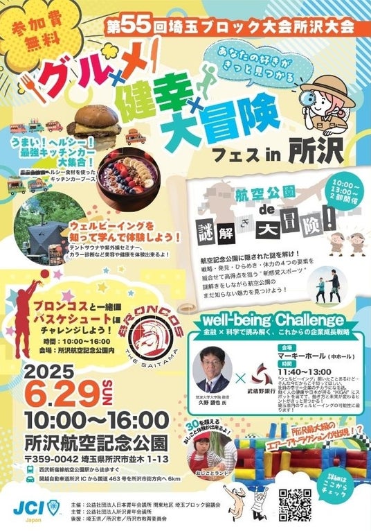 公益社団法人日本青年会議所埼玉ブロック協議会が主催する埼玉ブロック大会は今年で55回目を迎えます。「健幸」をテーマにした今大会にはグルメあり、お子様の大好きなエアーアトラクションや謎解き冒険イベントあり、フリマや各企業の体験ブースありと盛り沢山な内容となっています。