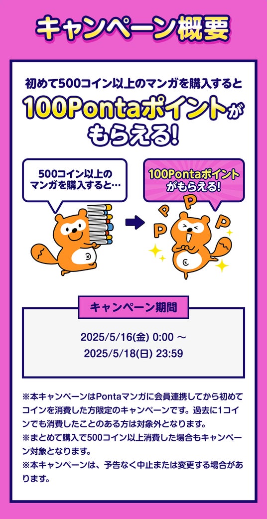 Ponta マンガに Ponta 会員ID を連携してから初めて500コイン以上のマンガを購入した方に100Ponta ポイントを加算いたします。