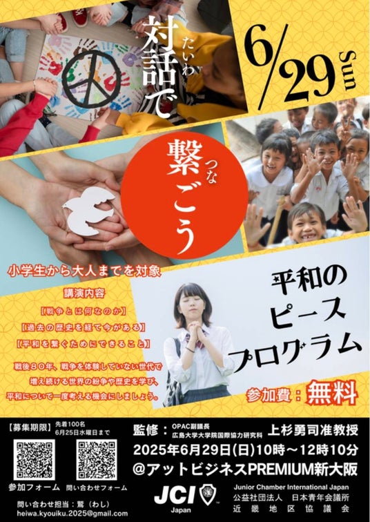 公益社団法人日本青年会議所近畿地区協議会(会長:辻川 大器 所在地:一般社団法人 和歌山青年会議所 〒640-8227 和歌山県和歌山市西汀丁36番地 和歌山商工会議所5F)は近畿地区において平和に寄与できる行動をとれる人財の発掘を目的として近畿地区の小学生・中学生・高校生・大学生・保護者を対象に、対話で繋ごう、平和のピースプログラムを開催いたします。