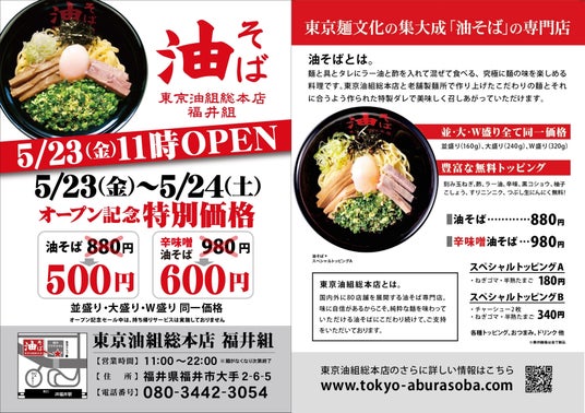 【福井県初出店!】油そば専門店『 東京油組総本店 福井組 』5月23日(金)オープン!