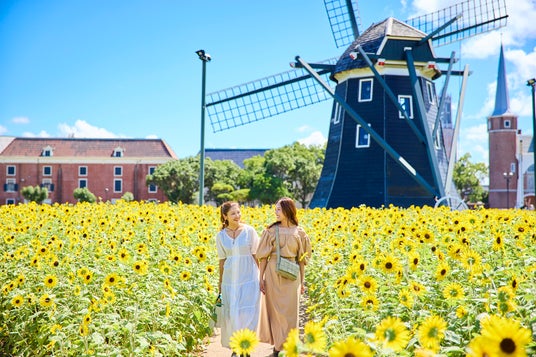 青空とレンガ造りの建物が並ぶ異国情緒たっぷりの街並みの中で、ひまわりが絵画のように咲き誇る、この時期だけの絶景をお楽しみください。