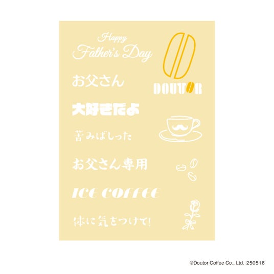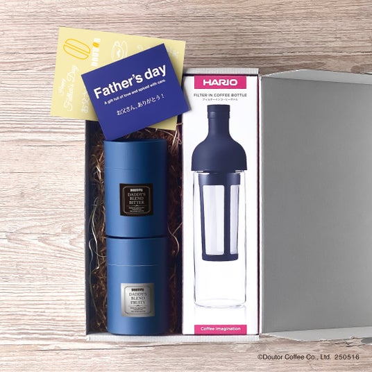 すっきりとクリアで飲みやすい「ダディーズブレンド ビター」と、フルーティーで香ばしい「ダディーズブレンド フルーティ」を、手軽に楽しめる「HARIOフィルターインコーヒーボトル」とセットにした、ドトール オンラインショップ限定ギフトです。気持ちを伝える父の日メッセージカードと、ボトル本体や持ち物などをお好みでデコレーションできるオリジナルステッカー付き。シンプルなアイスコーヒーボトルを、お父さん仕様にして楽しんでいただけます。