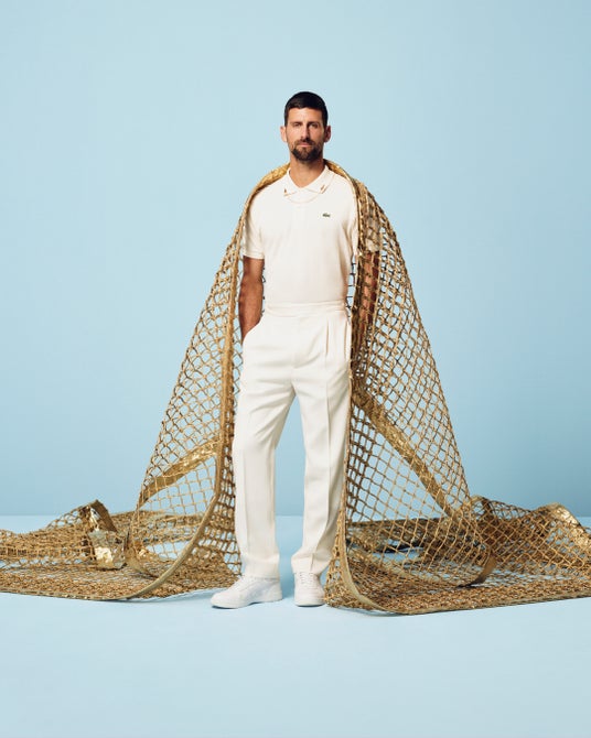 ノバク・ジョコビッチ × ラコステのポロシャツ - コートの王者アイコニックなオフホワイトのポロシャツを纏い、黄金のテニスネットをマントのようにまとったノバク・ジョコビッチ。その姿は彼の“史上最強”としての存在感と、ポロシャツのタイムレスな魅力を見せてくれる一枚です。