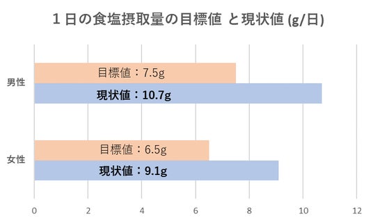 厚生労働省が定めている食塩の目標量は男性で7.5g未満、女性で6.5g未満となります※1。しかし国民健康・栄養調査結果によると令和5年の食塩摂取量は男性10.7g、女性9.1gで男女ともに目標量と約3g乖離があり10年間の年次推移でも摂取量は横ばいに。また、ヨシケイ調べでは30%以上の方が「食事で塩分を気にしている」と回答しています※2。日ごろから食塩量を気にしていても知らない間に多く摂取してしまう